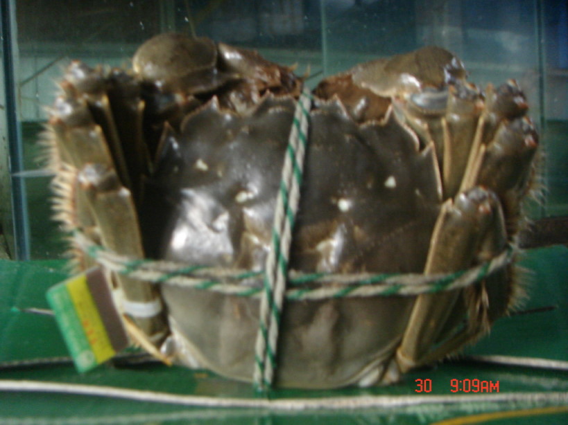 •     中華絨螯蟹,又稱河蟹、大閘蟹,屬于節肢動物門→甲殼綱→十足目→方蟹科→絨螯蟹,中華絨螯蟹在食性上具有五個方面的特點,即廣譜性、暴食性、互殘性、耐饑性和階段性。中華絨螯蟹肉味鮮美,營養豐富,是酒店、飯店宴席上的高檔水產品之一,并以其青背、白肚、金爪、黃毛、膏肥、黃豐的天然優質品質享譽海內外。其身體分兩部分,頭胸部和腹部,附有步足5對。每百克含蛋白質14克,脂肪5.9克,富含鈣、磷、鐵、維生素A、硫胺素、核黃素、碳水化合物、尼克酸等人體所需要的多種營養成份,經濟價值很高。目前中華絨螯蟹已成為我省淡水水產的主導產業。以DB32/609.1-2-2003有機蟹為執行標準,“寶應湖”牌中華絨螯蟹多次被授予“江蘇名牌產品”和“江蘇名牌農產品”稱號,蟬聯三屆獲得“中國十大名蟹”的稱號,并多次獲得全國各類展會比賽金獎。